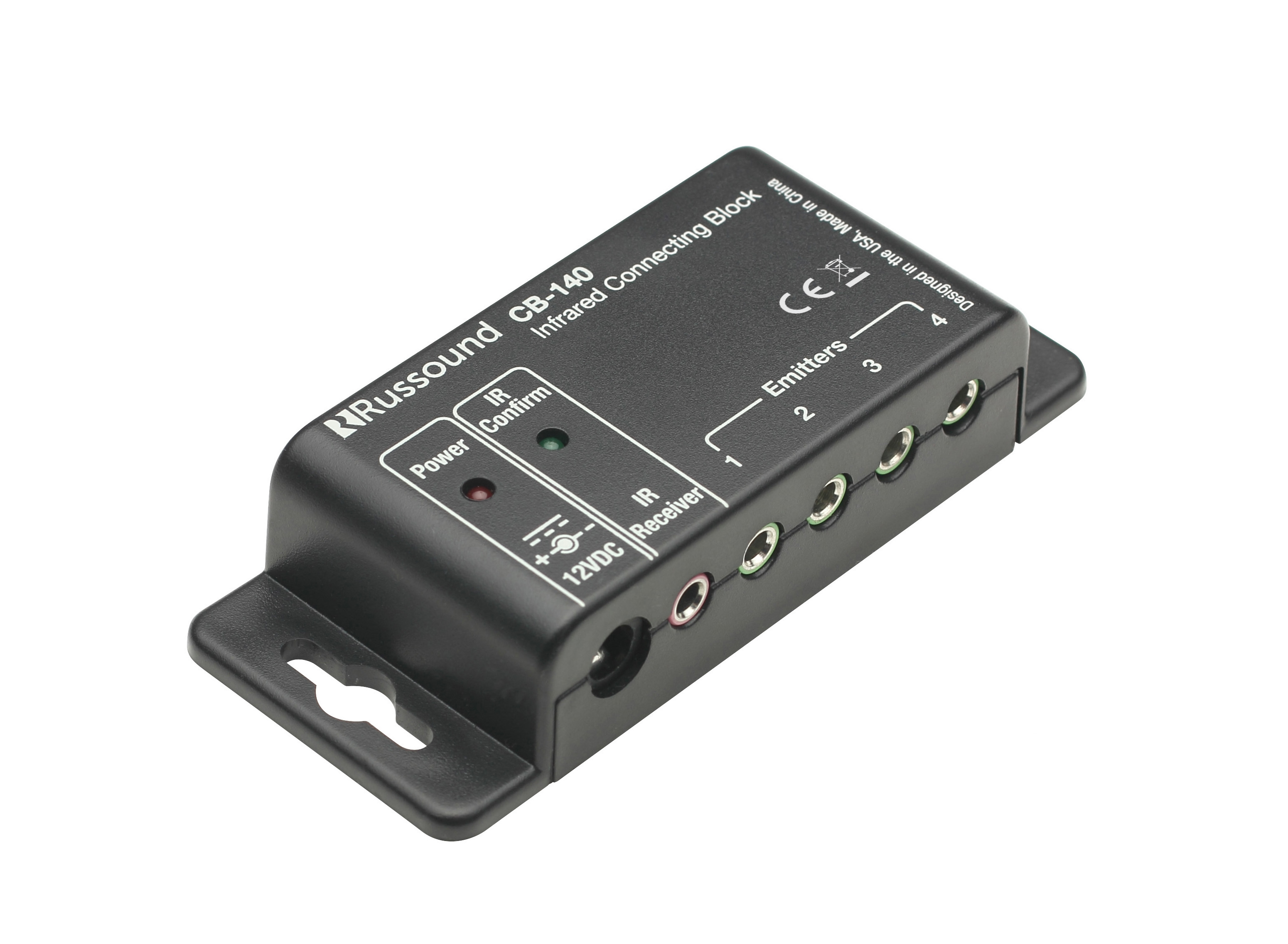 The CB-140 supports up to four components using the Russound IRE-1 single emitters or up to eight components using Russound IRE-2 dual emitters (also compatible with Russound SaphIR emitters). It also includes a jack for a Russound SLM-1 surface-mount receiver or 854 tabletop receiver.