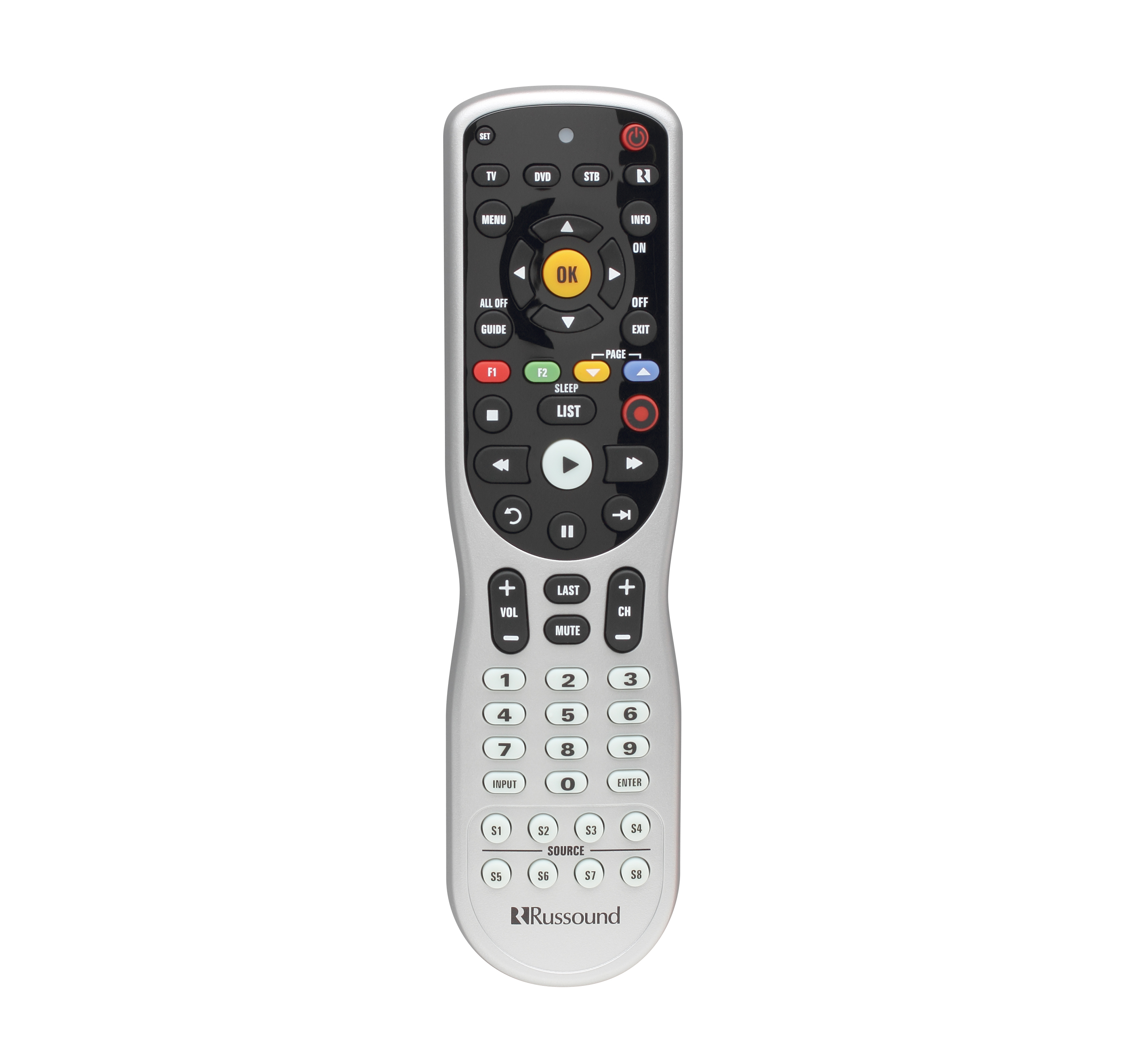 With an easy to use layout of commonly used source control buttons to quickly access music, the USRC is an attractive option for system control. Page Up and Page Down keys along with standard cursor keys support on-screen menu navigation. Discrete source keys allow selection of sources on the Russound systems without needing to scroll through a list. F1 and F2 Favorite keys access MCA-Series System Zone Favorites, and a Sleep button enables the MCA-Series system Sleep Timer function.