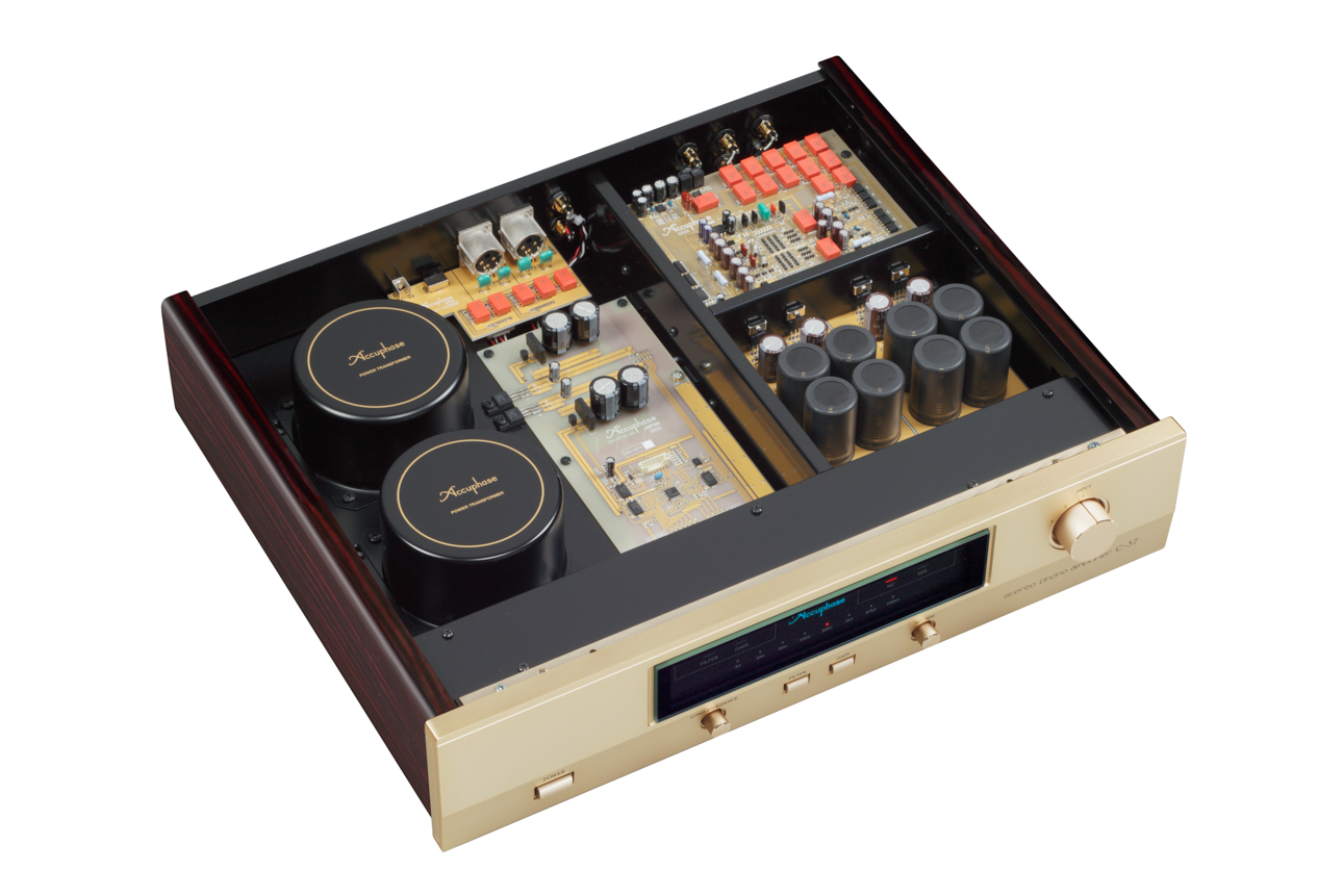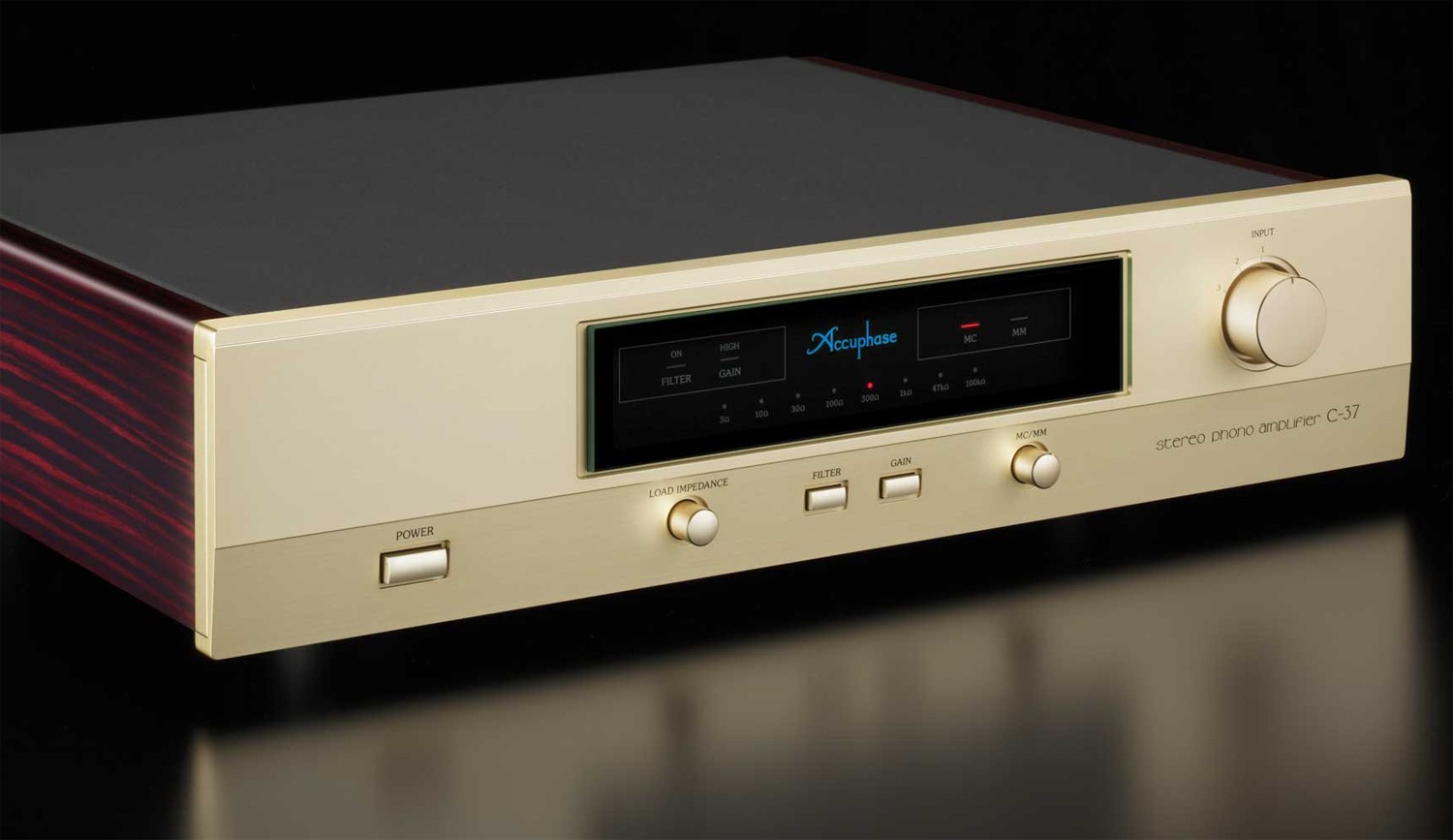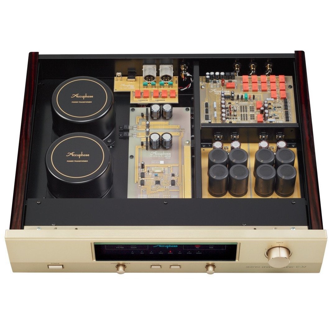 The C-37 is designed to match the Accuphase 40th anniversary models C-3800 and C-2820, the C-37 is a no-compromise standalone phono equalizer amplifier incorporating latest circuit design and utilizing materials and parts with optimal sonic qualities, making it capable of exploring the possibilities of the analog disc to the fullest. The phono amplifier must accurately handle the minute signal while keeping distortion and noise to an absolute minimum. In the C-37, these goals are achieved by employing completely separate MC head amplifier and equalizer sections, and keeping the left and right channels also separate. This enables the C-37 to fully bring out the characteristics and sonic qualities of any phono cartridge, allowing the listener to explore the legendary musical depth of analog discs. In terms of physical appearance, the gold-colored panel face and side panels of real wood with natural grain finish exude an aura of refined elegance, making the C-37 a perfect match for the C-3800 as well as other models such as the C-2820 or C-2420.