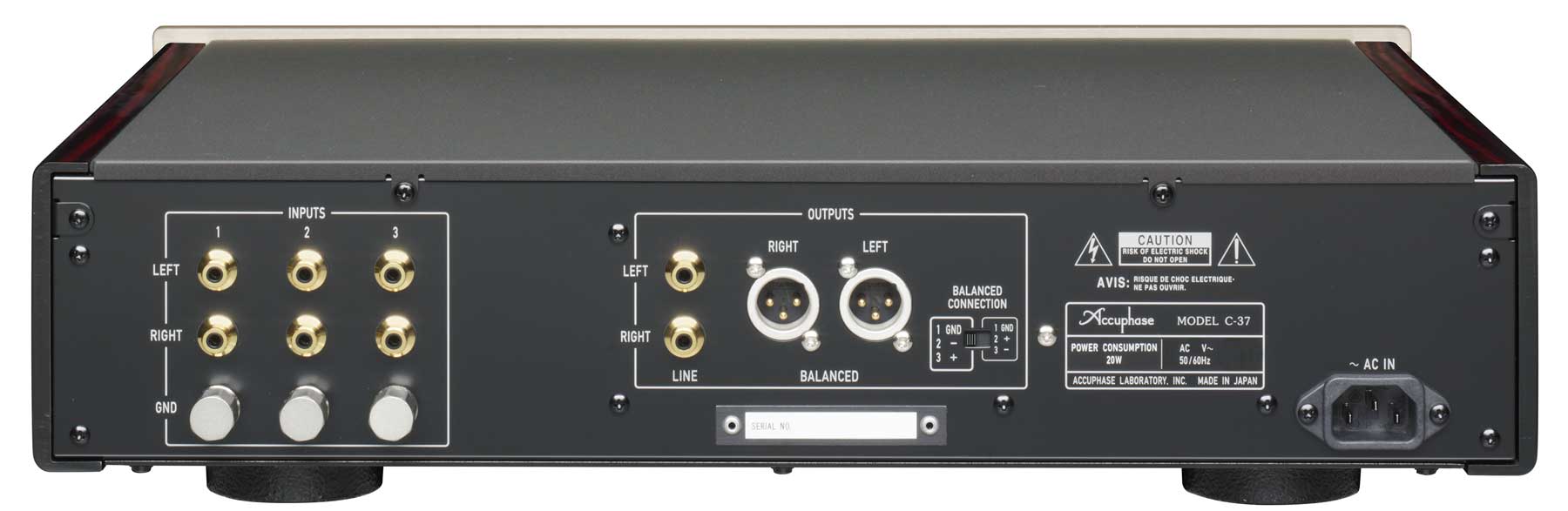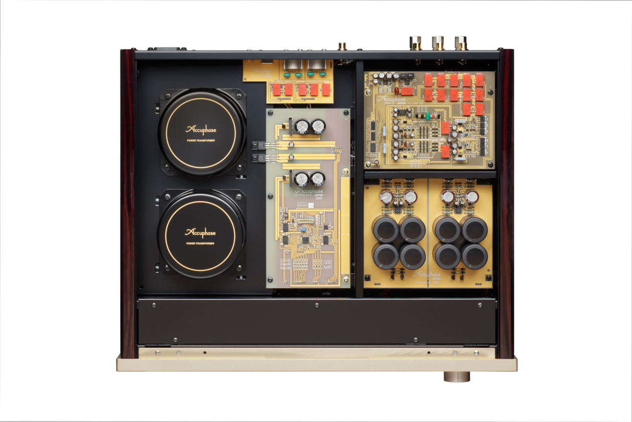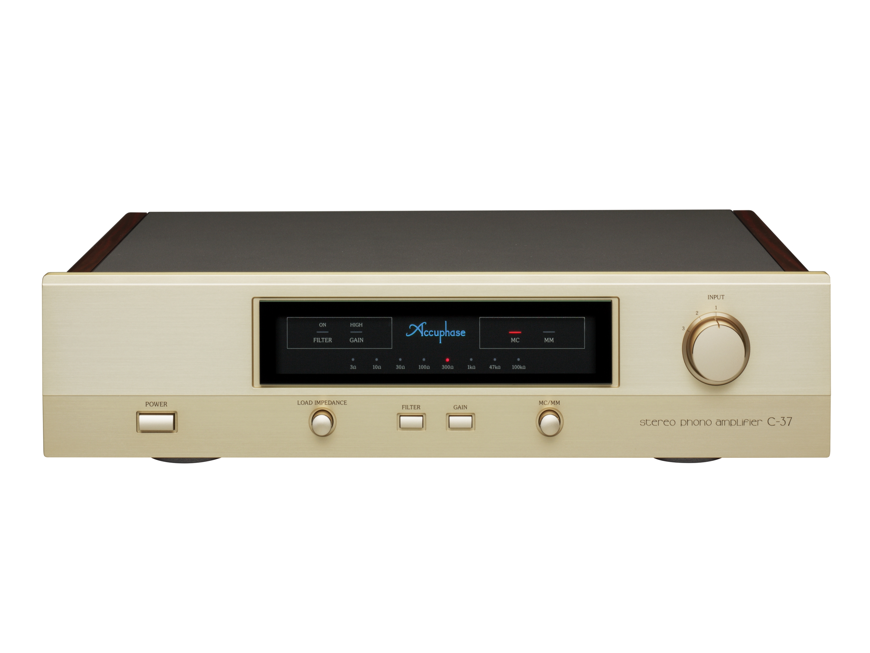 The C-37 is designed to match the Accuphase 40th anniversary models C-3800 and C-2820, the C-37 is a no-compromise standalone phono equalizer amplifier incorporating latest circuit design and utilizing materials and parts with optimal sonic qualities, making it capable of exploring the possibilities of the analog disc to the fullest. The phono amplifier must accurately handle the minute signal while keeping distortion and noise to an absolute minimum. In the C-37, these goals are achieved by employing completely separate MC head amplifier and equalizer sections, and keeping the left and right channels also separate. This enables the C-37 to fully bring out the characteristics and sonic qualities of any phono cartridge, allowing the listener to explore the legendary musical depth of analog discs. In terms of physical appearance, the gold-colored panel face and side panels of real wood with natural grain finish exude an aura of refined elegance, making the C-37 a perfect match for the C-3800 as well as other models such as the C-2820 or C-2420.