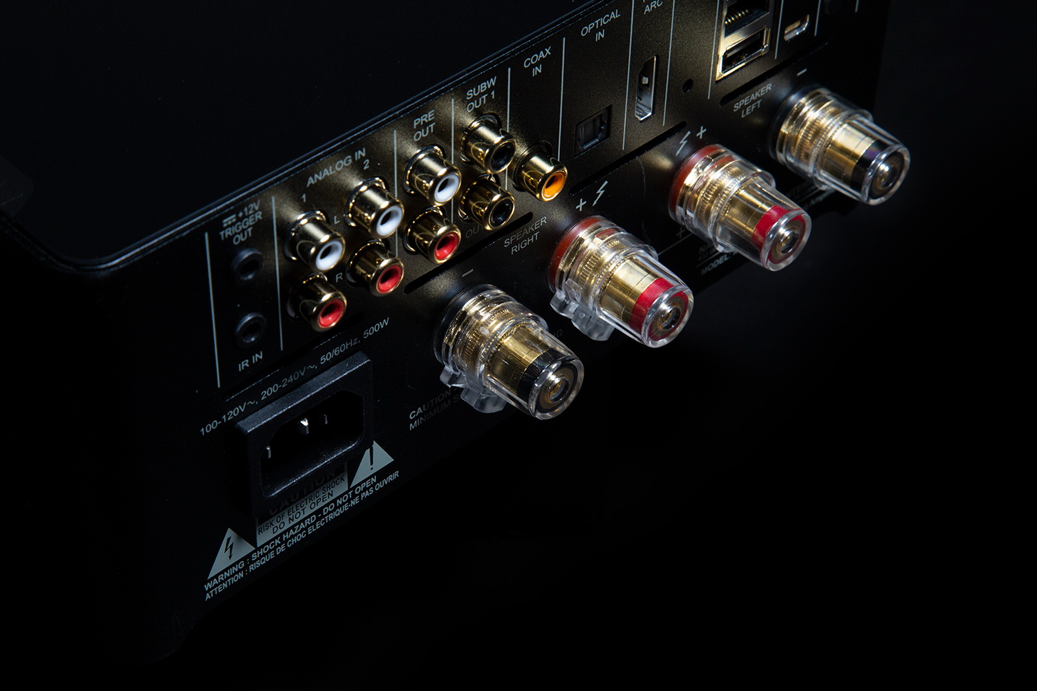 Усилитель поддерживает MQA, AirPlay 2 и 15 стриминговых сервисов, включая Amazon, Spotify, Tidal, TuneIn, Napster, Deezer, Qobuz и другие. Сзади расположились RCA, оптический и коаксиальный входы, USB, HDMI ARC, выходы предусилителя и выход на сабвуфер. Мощность составляет 100 Вт на канал, усиление работает по фирменной технологии HybridDigital, доступен и мостовой режим.