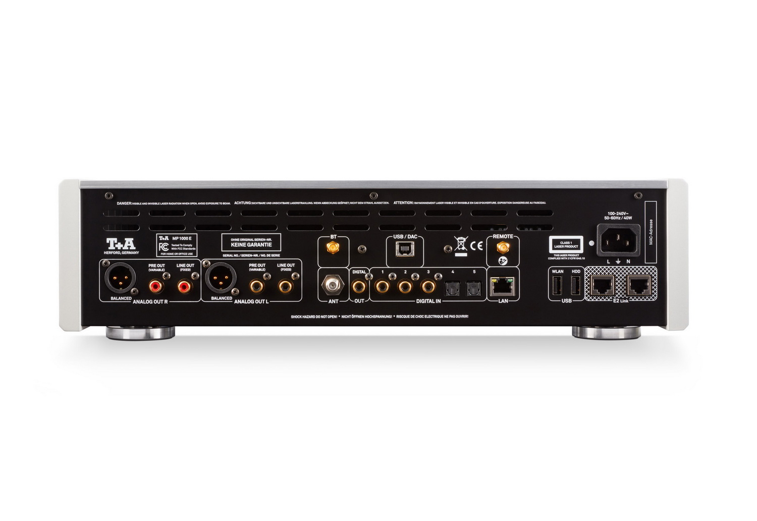 При подключении к USB на проигрыватель можно передавать файлы в качестве до 32 бит/ 384 кГц, ровно как и DSD256. Встроенный дифференциальный ЦАП конструкции «двойное моно» Burr Brown совмещен с аналоговыми выходными каскадами аудиофильского класса с широкой полосой пропускания. Инженеры компании оснастили эту связку прецизионным механизмом ресинхронизации тактовой частоты, который избавляет сигнал от джиттера. Кроме того, все цепи надежно экранированы, чтобы оградить полезный сигнал от внешних наводок. Именно эта комбинация, как считает компания, позволяет устройству звучать максимально натурально. Проигрыватель T+A MP 1000 E оснащен балансными и небалансными выходами.