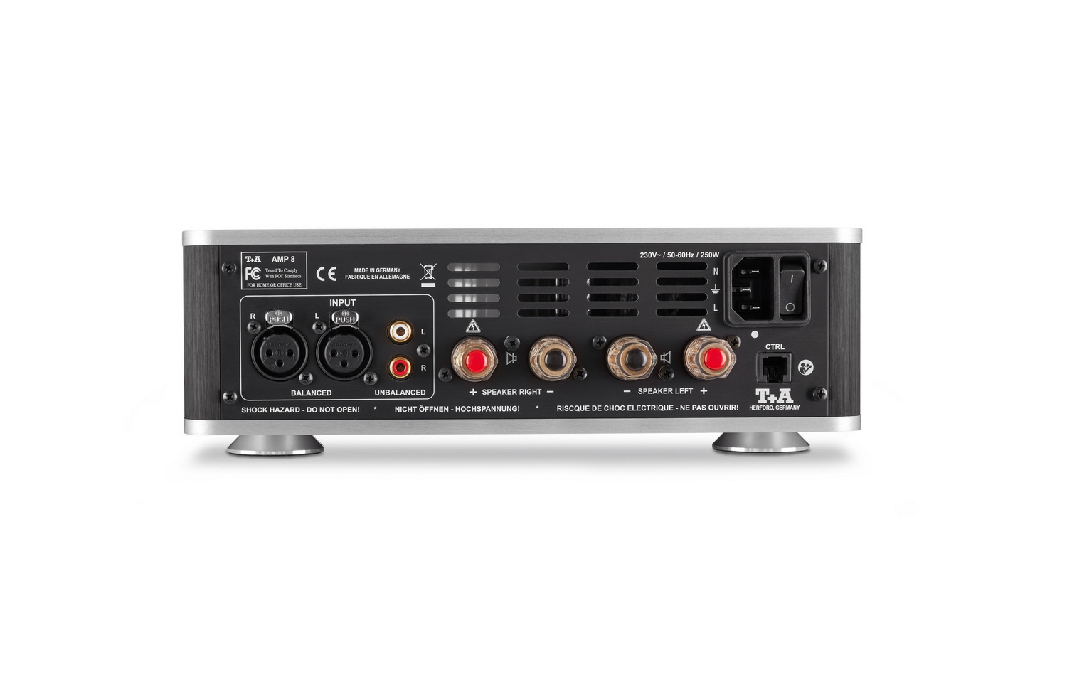 Концепция схемотехники AMP 8 перекликается со знаменитым интегральником PA 3000 HV, использующим высокое напряжение (HV - High Voltage) для работы входного каскада. На входе T + A AMP 8 применены полевые транзисторы и каскодное усиление в классе А по схеме Хаксворда. В начинке усилителя широко применяются специально отобранные аудиофильские компоненты – пленочные резисторы Vishay и конденсаторы WIMA и ELNA. На выходном каскаде работают скоростные транзисторы ThermalTrak, обеспечивающие высокую стабильность параметров в цепи. Каскады усиления тока и напряжения полностью изолированы друг от друга, и каждый из них имеет свой собственный источник питания. Таким образом, устраняется вероятность влияния акустики на усилитель напряжения. Впервые подобное решение было применено в фирменной R-серии T+A и получило название ICA (изолированный усилитель тока).